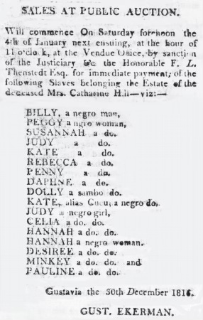 ”Fri införsel och handel af svarta slafvar eller så kallade nya negrer från Africa förunnas alla nationer utan att erlägga någon avgift vid utlossandet.”