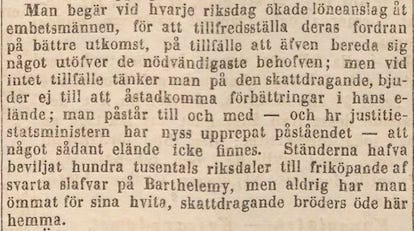 ”Ständerna hafva beviljat hundra tusentals riksdaler till friköpandet af svarta slafvar på Barthelemy, men aldrig har man ömmat för sina hvita, skattdragande bröders öde här hemma.”