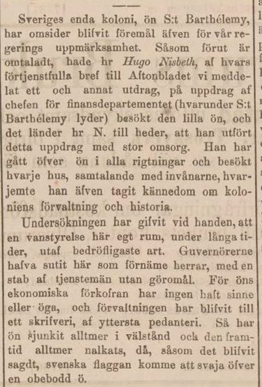 De kommande åren präglades ön av fattigdom – svenska offentliga byggnader förföll och invånare utvandrade. Kolonin blödde pengar och Sverige försökte hitta någon som ville ta över den. Den 8 mars 1877 publicerade Göteborgs Handels- och Sjöfarts-Tidning en artikel som nämner Hugo Nisbeth, en svensk publicist som nyligen besökt Saint-Barthélemy på uppdrag av finansdepartementet. Väl på plats konstaterade han att vanstyre ägt rum medan guvernörerna levt som ”förnäme herrar”. Artikeln argumenterade för vilka reformer som behövde genomföras för att undvika öns status som ”döende koloni” och göra den till en ”rik och härlig lustgård”.